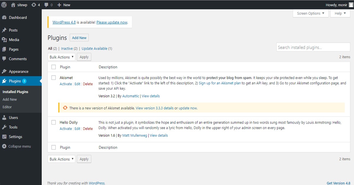 Bulk Actions এ ক্লিক করে যেকোনো একটি অপশন সিলেক্ট করতে পারেন। প্লাগইন বক্সগুলো চেক করে update, delete, activate এবং deactivate এর মধ্যে যেকোনো একটি করার জন্য Apply বাটনে ক্লিক করুন।