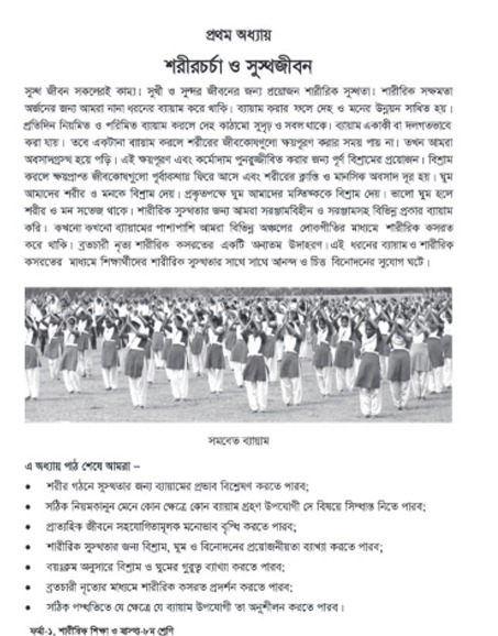 বইটির প্রথম অংশে শারীরিক ব্যায়াম ও ক্রীড়া সম্পর্কে আলোচনা করা হয়েছে। এতে বিভিন্ন ধরণের ব্যায়াম, খেলাধুলার নিয়ম-কানুন ও শারীরিক সক্ষমতা বৃদ্ধির উপায় ব্যাখ্যা করা হয়েছে। নিয়মিত ব্যায়ামের মাধ্যমে কীভাবে শরীরকে সুস্থ ও কর্মক্ষম রাখা যায়, তা শিক্ষার্থীদের শেখানো হয়।